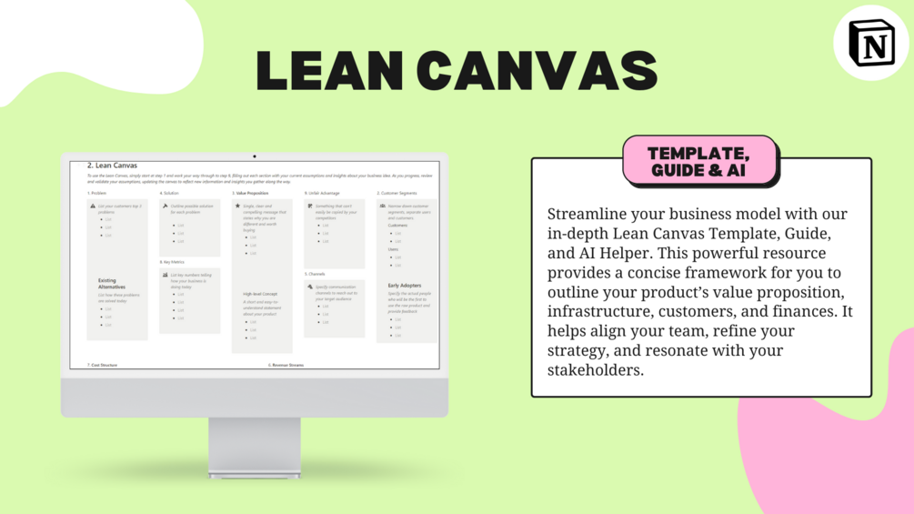 Each component in this bundle is designed to guide you through different aspects of product visioning, ensuring you cover all essential areas. From crafting a compelling vision statement, mapping out a vision board, and creating a lean canvas to presenting an elevator pitch, we've got you covered.